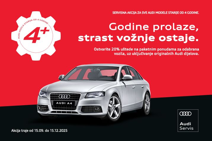 Posjetite svoj ovlašteni Audi servis i iskoristite povoljne cijene paketnih ponuda za vozila starija od 4 godine, uz uštedu od 20%. Paketi uključuju ugradnju Originalnih dijelova u vašem ovlaštenom servisu, uz vrhunsku uslugu.